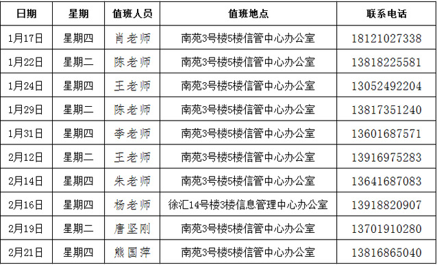 根据学校寒假工作的安排,信息管理中心1月16日至2月21日实行轮休值班,轮休期间,信息管理中心服务时间如下: