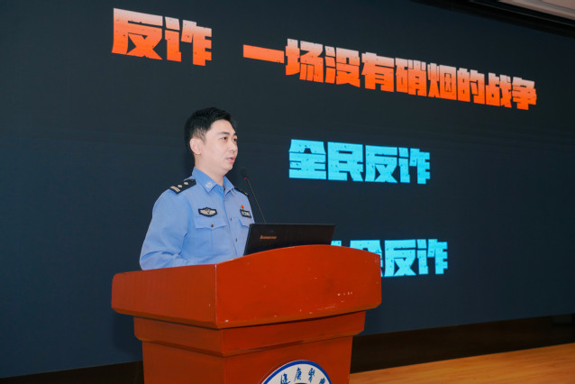 开幕式后,2023年“浦东十大杰出青年”、刑侦支队反诈中心副队长胡巧悦带来反诈主题课。他拆解“刷单返利”“冒充客服”“虚假购物交易”等高校高发案例,揭露诈骗话术套路,并通过互动问答强化师生防骗能力。针对学生群体易陷入的“兼职陷阱”、“情感诈骗”等常见骗局,胡警官提出的“不轻信陌生链接、不透露个人信息、不转账汇款”的“三不”提醒,引发了全场的共鸣。