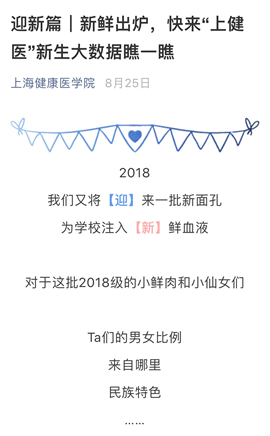 迎新日前,在接受到新生数据后,继续联合今日校园发布的《上海健康医学院2018新生大数据》,诙谐的语言、活泼的画面,让新生能够直观了解入学情况,大数据一经推出,收获了不少家长的好评和点赞。