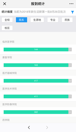 在8月26日以及9月8日迎新日当天,学校里设置了“一屏知晓”报到现场,将各种数据汇集并实时推送出来,根据新生、家长、工作人员的需求对各类终端提供了较为人性化的个性化呈现形式。无论是校内三块大屏幕和多台一体机,还是远程的电脑端、都可以实时动态地了解和掌握新生报到、住宿等各类数据,迎新现场、住宿办理的工作人员能根据报到信息调整对未办报到学生的工作安排,迎新更加科学化、精准化。迎新结束当天,第一时间多元化统计分析了学生报到数据,及时提供了本科和专科生的现场报到率,并对各学院各专业报到情况进行分析总结。