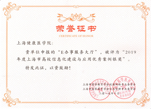 “E办事服务大厅”被评为2019年度上海市高校信息化建设与应用优秀案例银奖