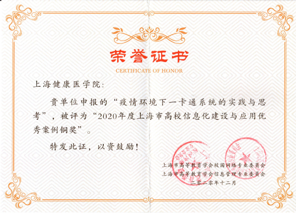 “疫情环境下一卡通系统的实践与思考”被评为2020年度上海市高校信息化建设与应用优秀案例铜奖